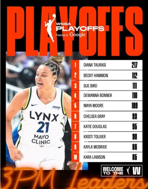 麦克布莱德季后赛三分命中数超越卡拉-劳森,升至WNBA季后赛历史第9位。