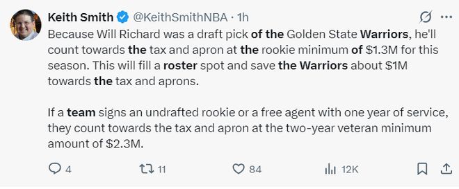 根据肯尼-史密斯的说法,因为理查德是勇士自主选中的新秀,他最多只占用130万的薪金空间,如果勇士要签一位不是自己选秀的球员或老将至少要占据230万的空间,所以签下理查德节省了100万的空间。